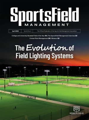 The April issue of SportsField Management examines the evolution of sports field lighting, highlights the SFMA College and University Baseball Field of the Year winner, details how a parks and rec department partnered with a local user group to add cricket to its facilities, and profiles a father and son who share their sports field management career journeys.